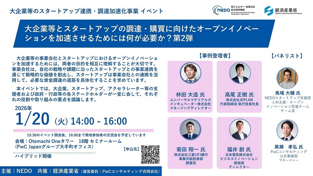 2025年12月24日(水) イベント 1/20(火)開催 NEDO主催 大企業等とスタートアップの調達・購買に向けたオープン イノベーションを加速させるためには何が必要か?第2弾 1/20(火)開催 NEDO主催 大企業等とスタートアップの調達・購買に向けたオープン イノベーションを加速させるためには何が必要か?第2弾 参加申込:https://forms.office.com/r/H8K4A6pL8h ※本イベントは、経済産業省とNEDOが主催する「大企業等のスタートアップ連携・調達 加速化事業」の一環です 【開催概要】 事業会社は、自社の戦略や課題に沿ったスタートアップとの事業連携を通じて戦略的な価値を創出し、スタートアップは事業会社との連携を活用して、必要な資金調達の道筋を具体化することを求めています。本イベントでは、スタートアップエコシステムに関わる大企業等の事業会社、スタートアップ、アクセラレーター等の伴走支援者および政府・行政等の各ステークホルダーが集まり、調達・購買を含むオープンイノベーションを加速するための要点を議論します。イベント後は、参加者間や事例企業とのネットワーキングも予定 しております。<申込方法> URL)https://forms.office.com/r/H8K4A6pL8h ※2026年1月14日(水)18時まで<開催日時>2026年1月20日(火) 14:00~16:00(予定)<開催場所(ハイブリッド開催)>・現地:東京都千代田区大手町1-2-1 Otemachi One タワー 18階 セミナールーム (PwCJapanグループ大手町オフィス)※最大100名程 https://otemachi-one.com/access/・オンライン:WebEx ※人数制限なし会場アクセス・WebExリンクは、開催2営業日前(1/16)までにご連絡します現地会場の申込みが多数の場合、オンライン参加をお願いする場合がございます。<プログラム>・なぜ今、大企業等におけるスタートアップからの調達・購買が注目されているのか?・大企業等における事業課題の抽出・分析と、オープンイノベーションを活用した課 題解決の取り組み紹介・スタートアップによる大企業等との調達・購買を通じたオープンイノベーションの 事例紹介・パネルディスカッション:大企業等とスタートアップがWIN-WINとなるオープンイノベーションに必要なアクションは何か?<事例紹介およびパネルディスカッションでの登壇者>・ユニバーサルマテリアルズインキュベーター株式会社 マネージングディレクター 林田 大造 氏・株式会社JEPLAN 代表取締役 執行役員社長 髙尾 正樹 氏・株式会社三菱UFJ銀行 事業共創投資部 調査役 菊田 翔一 氏・日本電気株式会社 ビジネスイノベーション統括部 ディレクター 福井 創 氏・新エネルギー・産業技術総合開発機構 スタートアップ支援部 人材支援・オープンイノベーション促進チーム チーム長 馬場 大輔 氏・PwCコンサルティング合同会社 マネージャー 黒瀬 孝弘 氏<このような方におすすめ!>・事業会社の新規事業・調達部門の責任者・担当者・スタートアップの経営層・事業開発担当者 ・スタートアップ支援機関、自治体、大学関係者 等<開催者>・主催:国立研究開発法人新エネルギー・産業技術総合開発機構(NEDO)・共催:経済産業省<問い合わせ先>大企業等のスタートアップ連携・調達加速化事業事務局(PwCコンサルティング合同会社)E-Mail:jp_cons_ec-su_collaboration@pwc.com [トップに戻る]